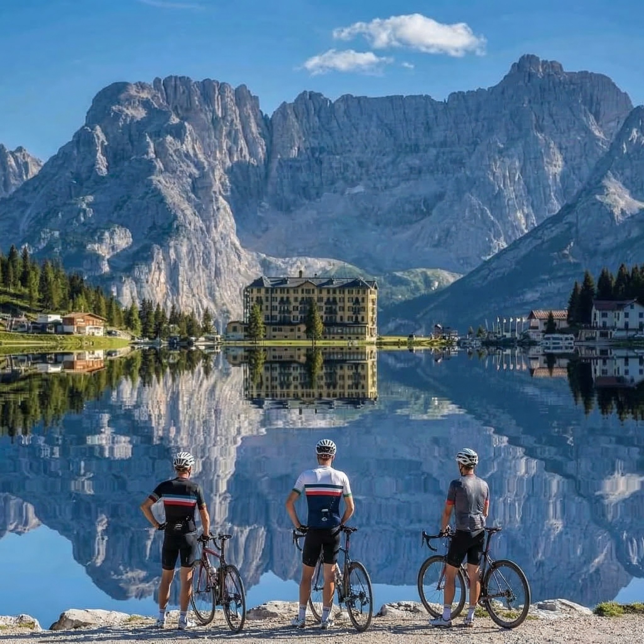 Today you ride into the image that's been living in your head since you booked this trip. The Dolomites don't build gradually - they announce themselves. Pale towers of rock rising out of green meadows, light shifting across stone that's been here for 200 million years. Once in Misurina, we ride up to the Tre Cime di Lavaredo - three vertical walls so perfect they look engineered. The kind of place where conversation stops on its own. You take it in, then descend back to Misurina for the night. The image stays with you long after the road ends.