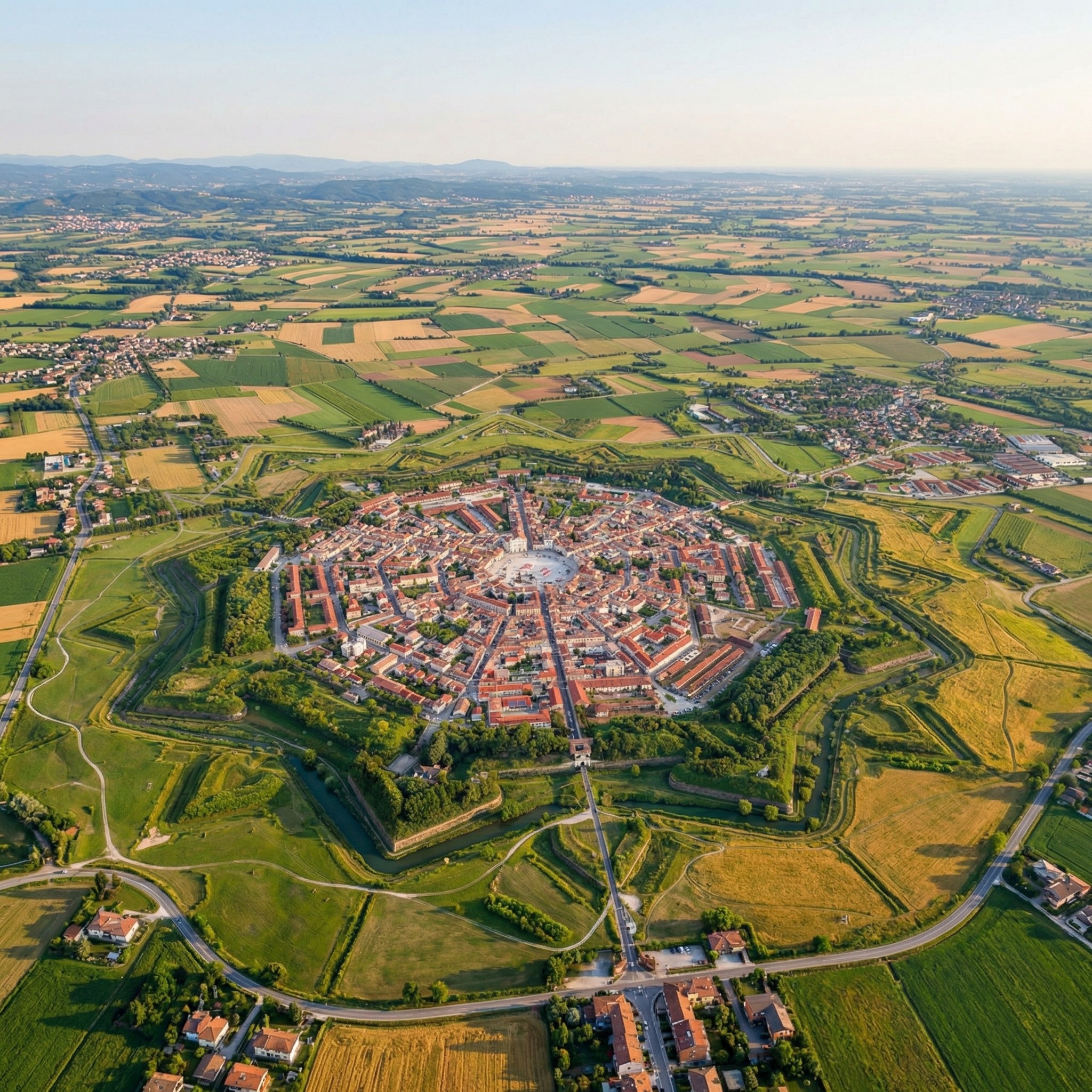 You land in Verona. A private transfer takes you northeast to Palmanova, a fortress town the Venetians built in 1593 in the shape of a perfect nine-pointed star. Check in, get fitted on your bike, and if time allows, walk into the old center for your first glass of Friulano. The week starts slow, on purpose.