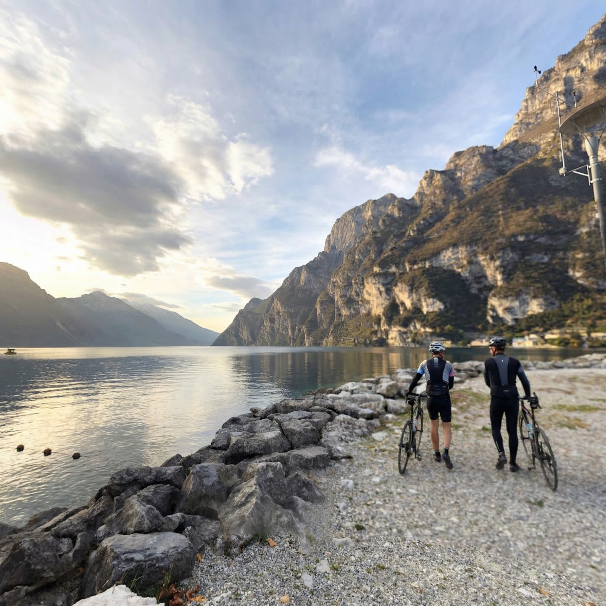 One last climb. Monte Bondone rises above Trento with views that make you stop pedaling just to look. Then the descent begins and everything changes - the temperature rises, the air turns soft, olive trees replace pines, and suddenly you're riding toward Lake Garda. We check in on the waterfront in Riva del Garda and gather for a farewell dinner on the lake. The kind of evening where nobody wants to leave the table.