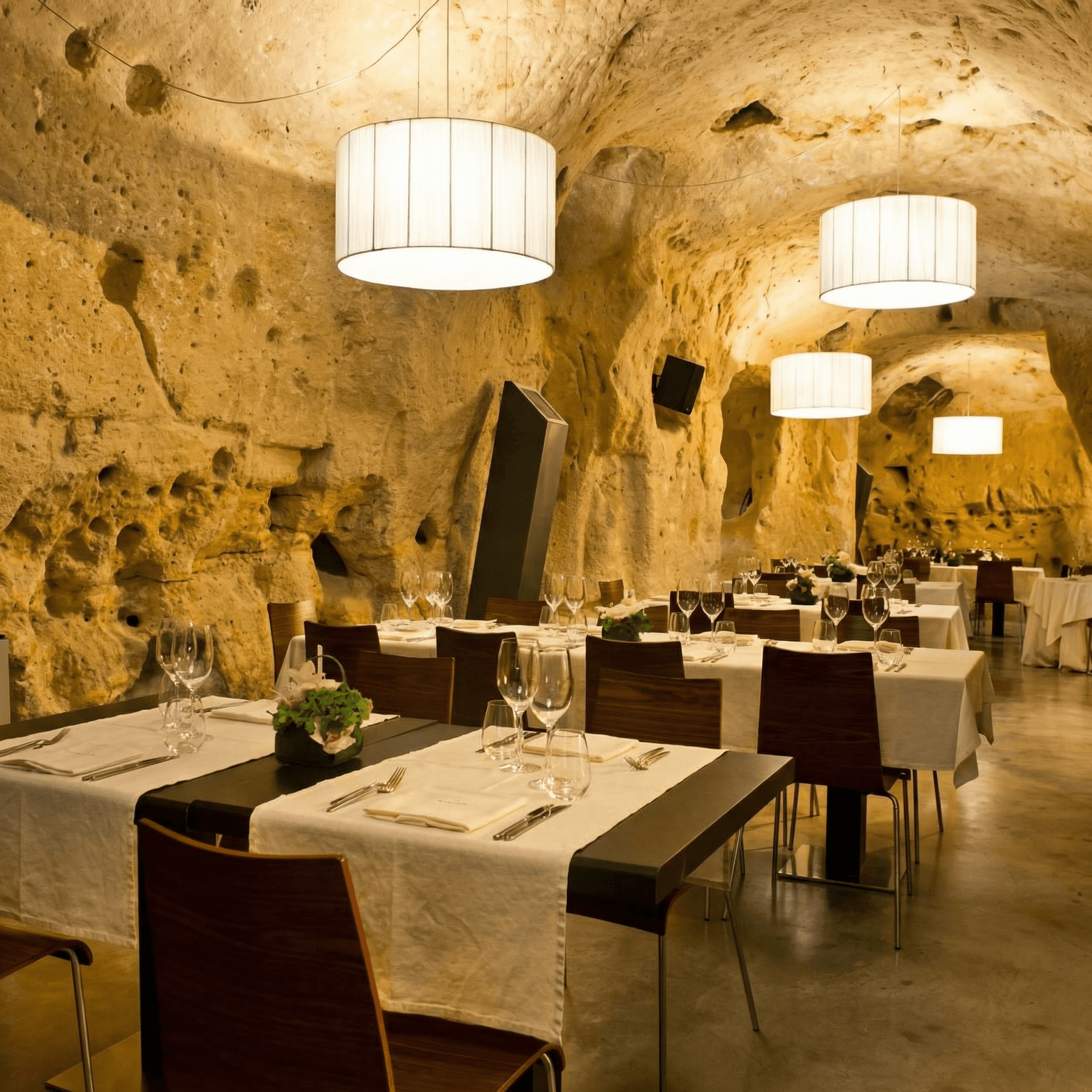 A morning ride through the Murgia plateau, past cave churches carved into the rock by monks a millennium ago. Coffee stop in Ginosa, then back to Matera by early afternoon with time for the pool or spa. In the evening, a guided walk through the Sassi as the sun goes down. Dinner in a restaurant carved directly into the rock.
