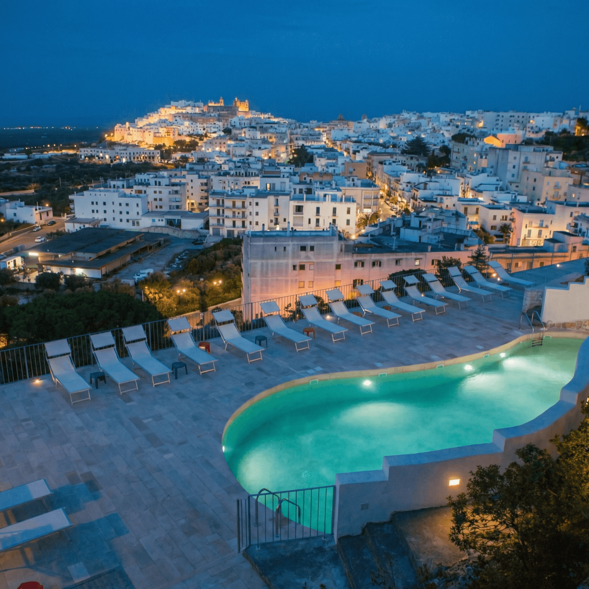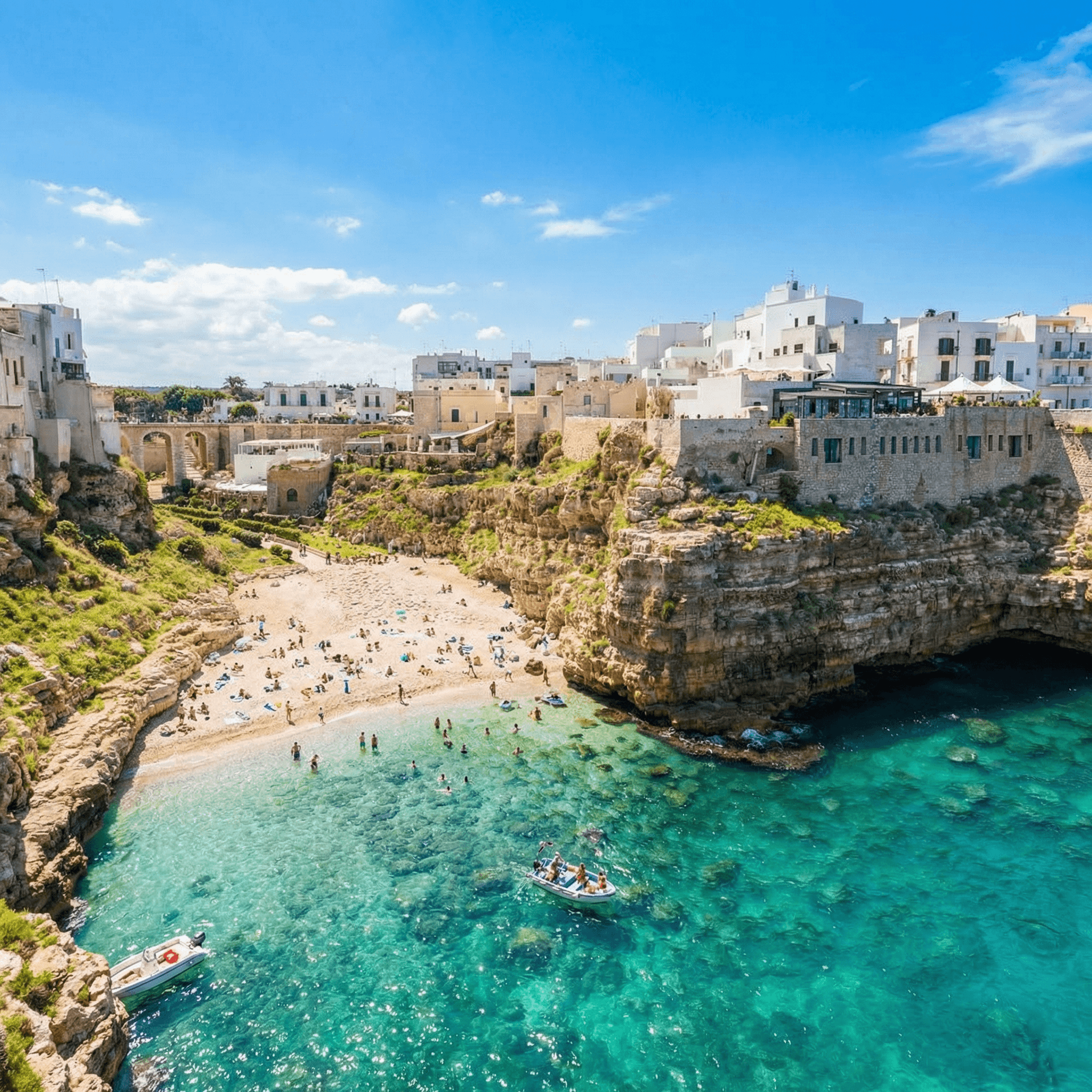 The flattest and most relaxed day of the trip. We ride toward the coast with a coffee stop by the sea, then lunch in the port town of Monopoli where the fishing boats are still tied up at the harbour wall. A short transfer brings us to Polignano a Mare - the town built on cliffs above the Adriatic, with the famous Lama Monachile cove carved between the rocks below. Check into Pietrablu Resort. Afternoon by the pool or the sea. Farewell dinner with the sound of waves underneath you.